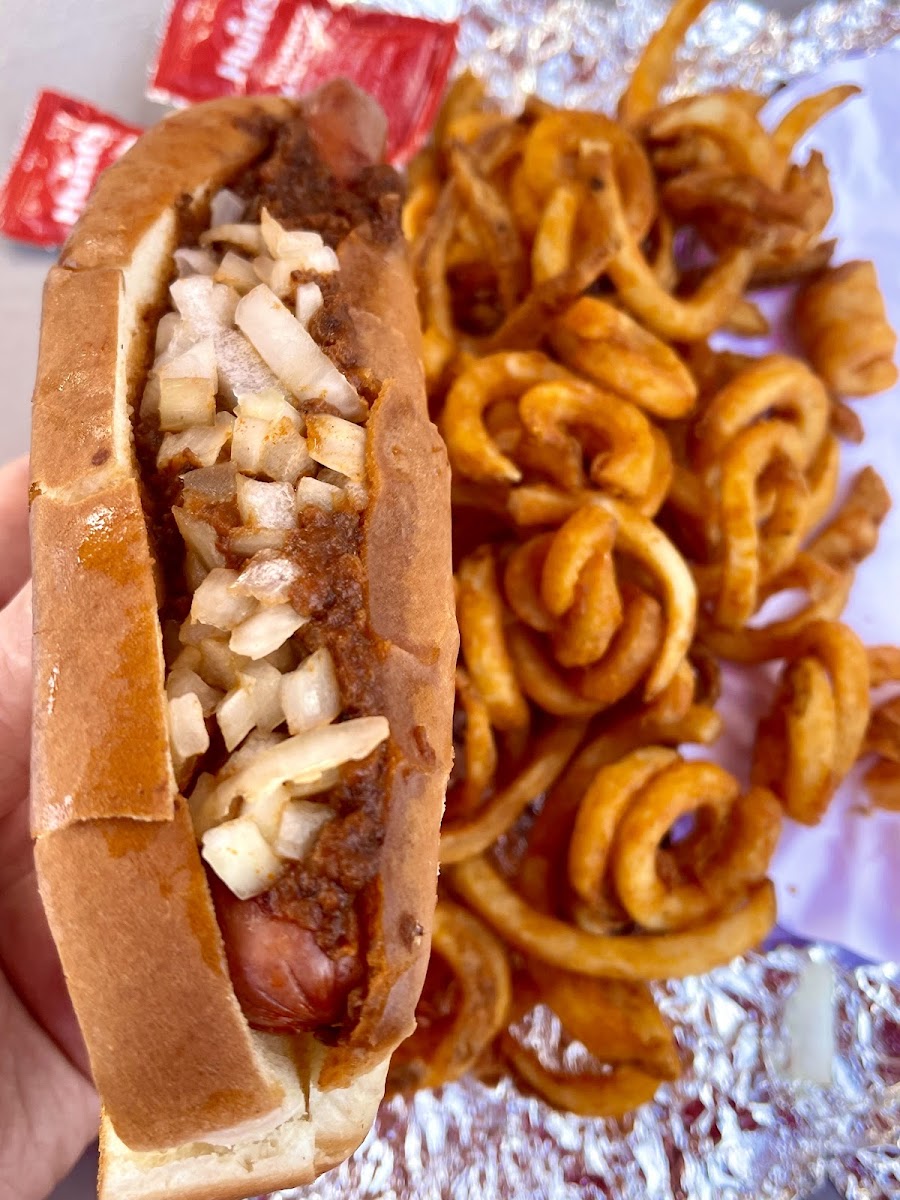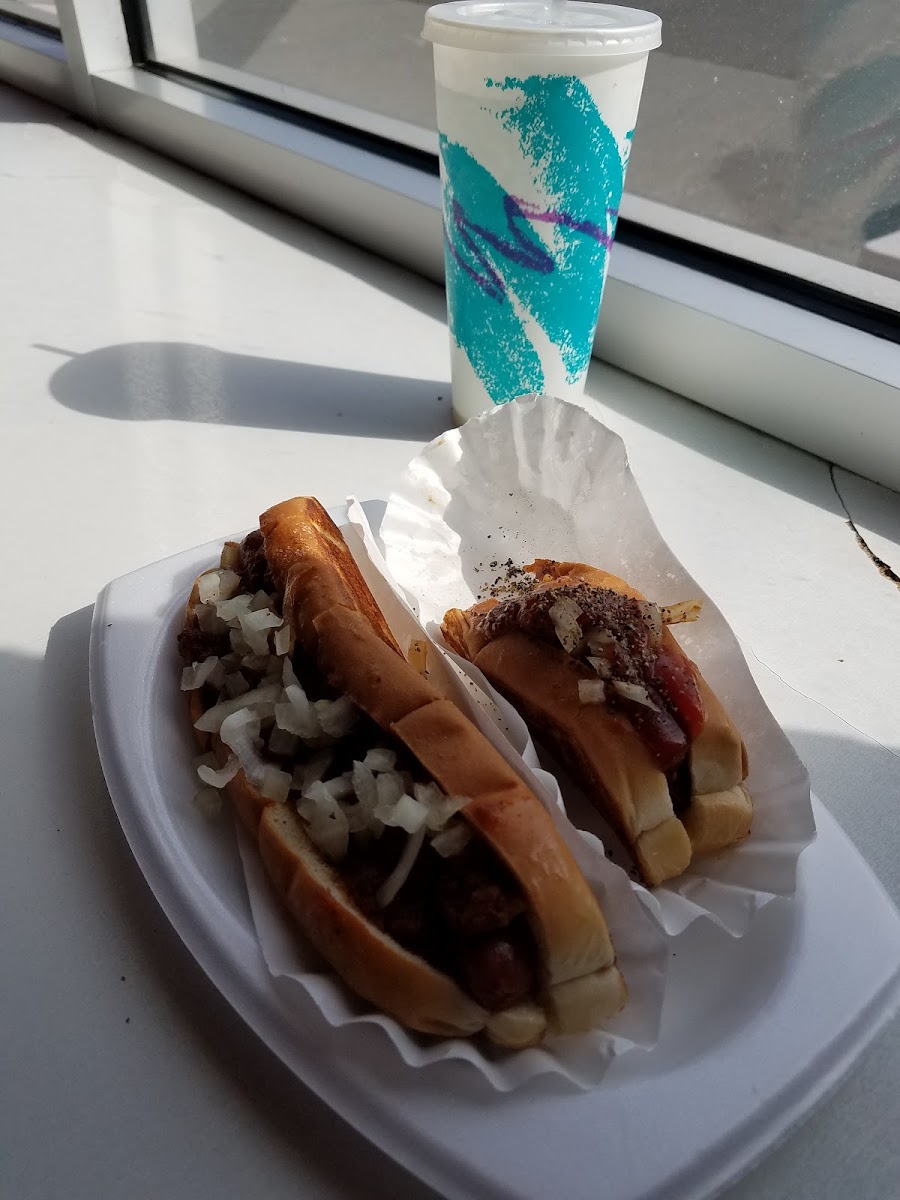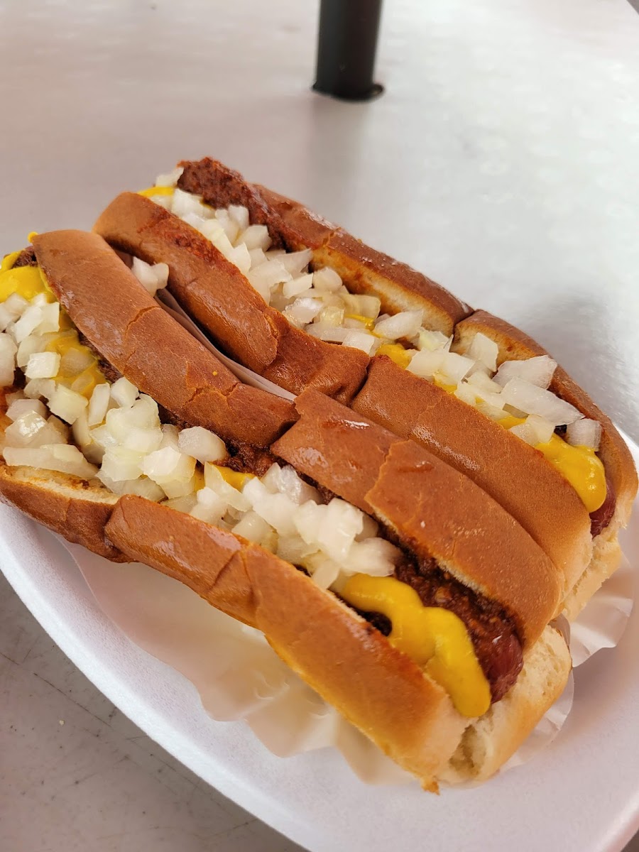 Awesome chili dogs!! Beef dogs. They also have a large variety of other foods! Order for take out or eat outside.