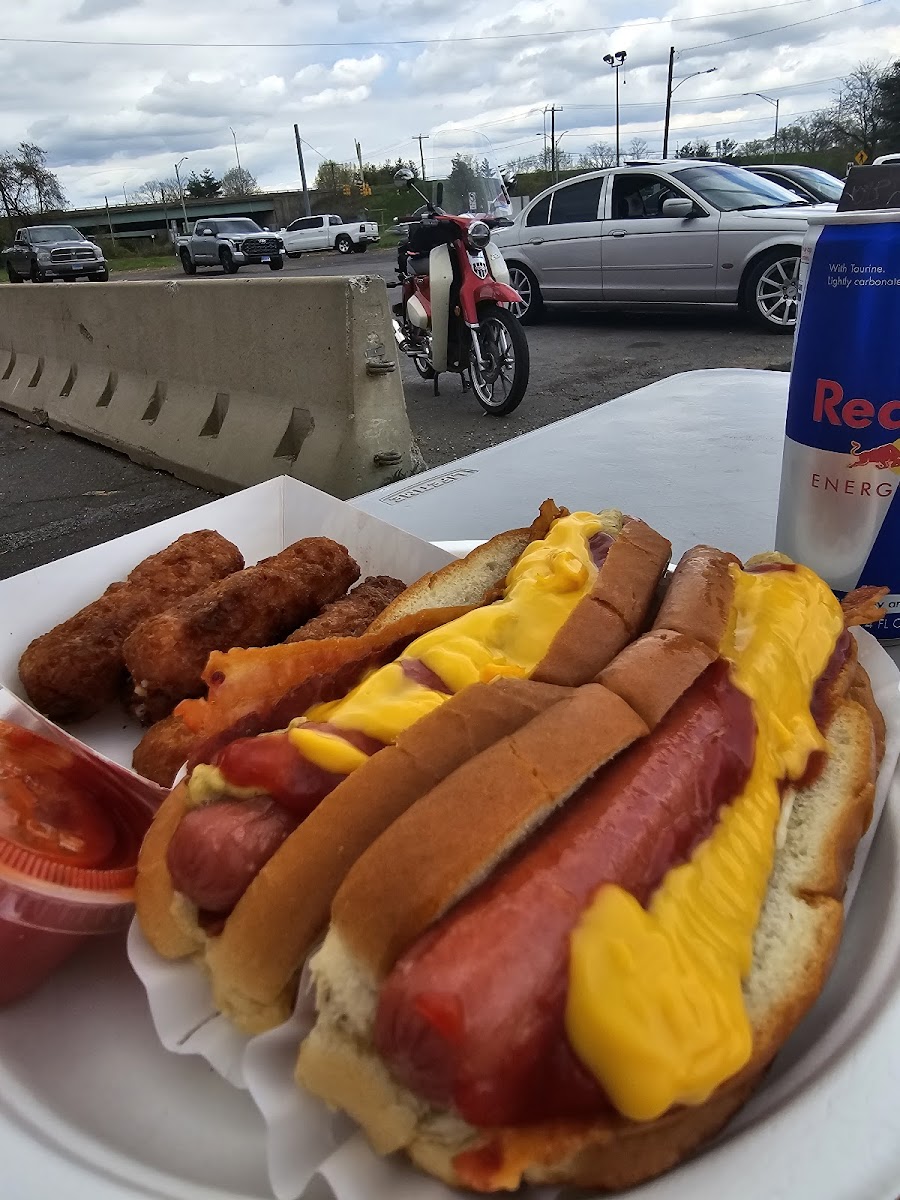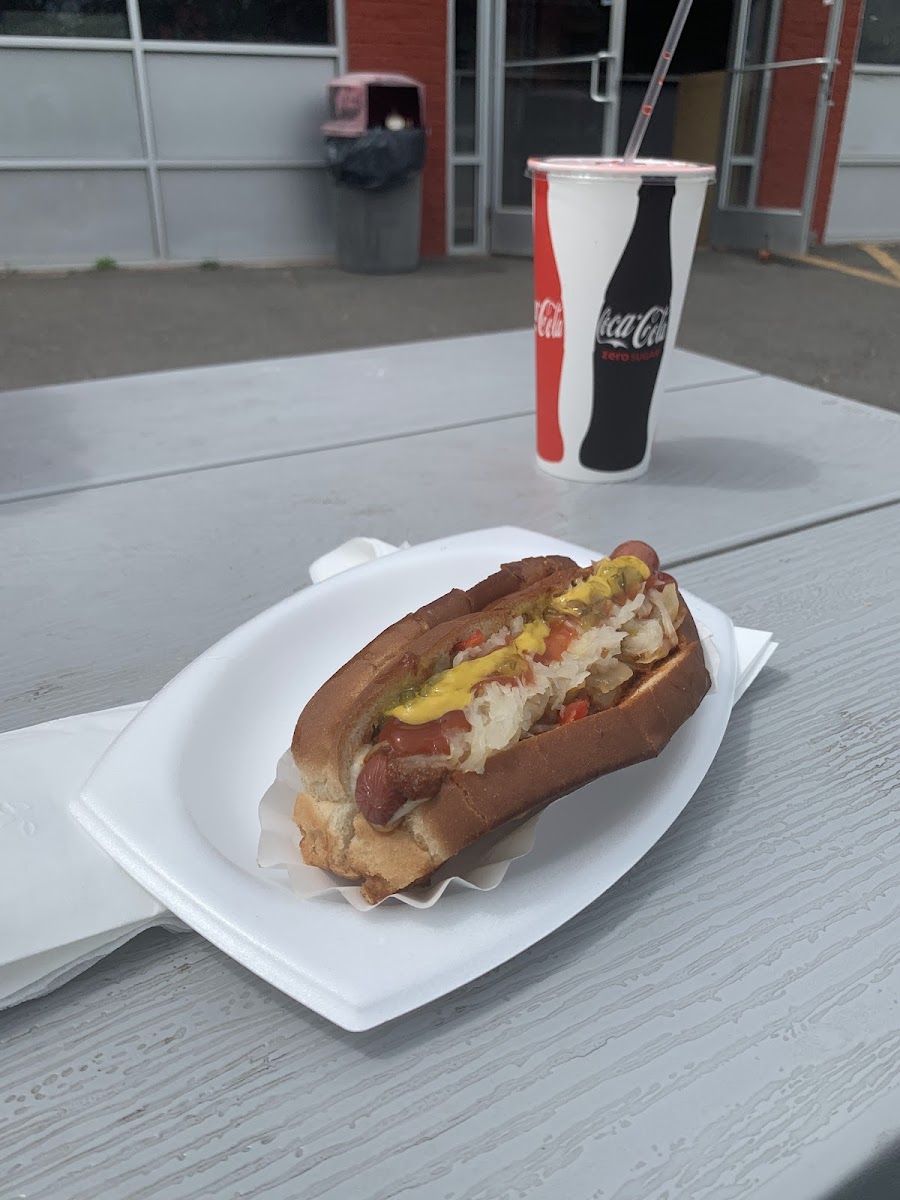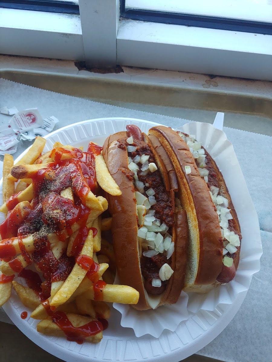 Awesome chili dogs!! Beef dogs. They also have a large variety of other foods! Order for take out or eat outside.